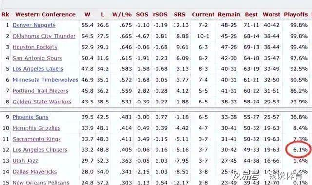五连败之后,一则尴尬的数据让快船处境雪上加霜。据美媒Basketball Reference的季后赛晋级概率统计,快船目前仅存6.1%的季后赛晋级希望,排名西部倒数第四,仅高于爵士(1.4%)、独行侠(0.4%)和鹈鹕(0.1%)三支球队。